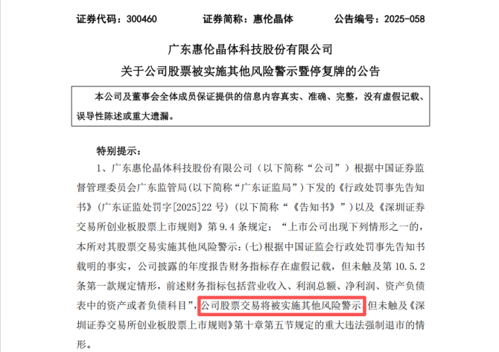 12月9日晚间,惠伦晶体发布公告称,公司自12月11日开市起复牌并实施其他风险警示,股票简称变为ST惠伦。