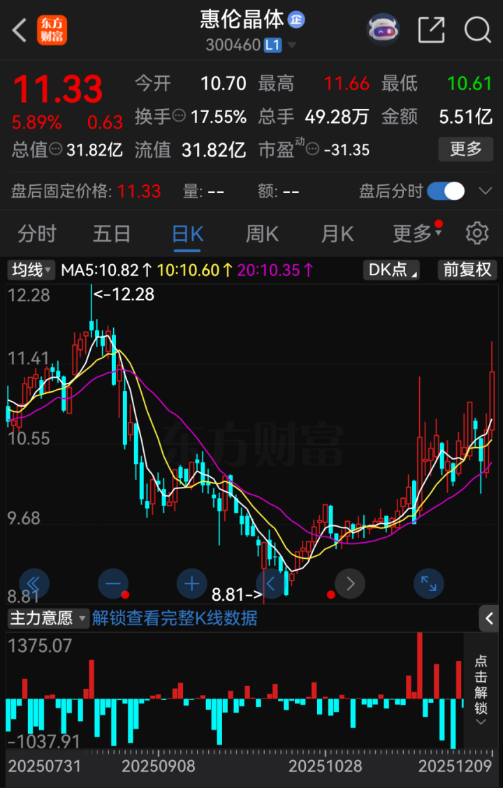 惠伦晶体自12月10日开市起停牌一天。12月9日收盘,惠伦晶体股价报11.33元/股,总市值为31.82亿元。