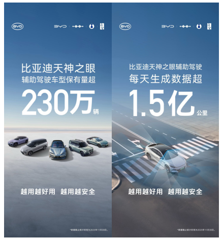 数据显示,截至2025年11月底,比亚迪搭载“天神之眼”驾驶辅助系统的车型累计销量已突破230万辆,持续蝉联中国辅助驾驶车型销量及系统装车量榜首。这标志着比亚迪推动的“全民智驾”战略已取得显著成效,智能驾驶正从高端配置加速向主流市场普及。
