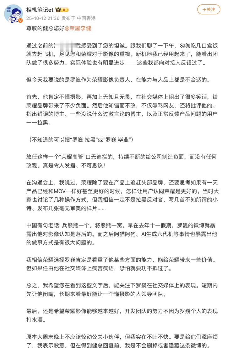 至于我们说提及的荣耀首席影像工程师罗巍,其言行存在的争议网络随处可查,确实也造成了对荣耀品牌的不利影响,荣耀竟说我们“恶意诋毁”、“言语攻击”罗巍,难道说事实有错了吗。那请问罗巍作为荣耀员工,骂用户和网友的时候呢?荣耀是默许他这种行为?有博主给荣耀CEO李健写信,希望对罗巍的言行进行处理,只可惜至今无回应。
